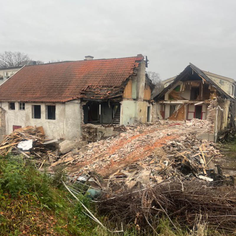 Nu har rivningen av Storgatan 154 påbörjats. En del av teglet och takpannorna sparas för att användas vid uppbyggnaden av den nya fastigheten.